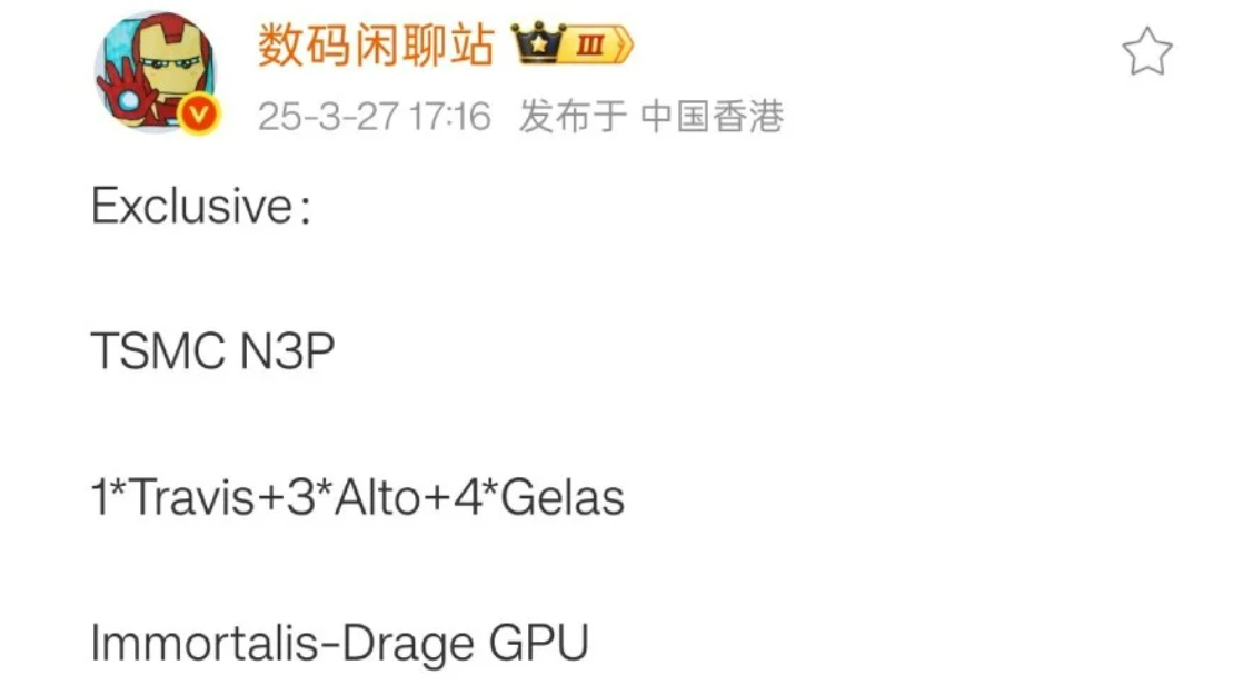 Компания MediaTek официально подтвердила, что её следующая флагманская однокристальная система на чипе Dimensity 9400+ выйдет 11 апреля. Это не полноценный новый процессор, а небольшое обновление уже существующего Dimensity 9400, но настоящее обновление придет с выходом Dimensity 9500. И если новая утечка верна, то теперь можно ознакомиться с его потенциальными возможностями. В сообщении от информатора Digital Chat Station, которое, однако, уже удалено, говорится, что чипсет Dimensity 9500 будет производиться с использованием технологического процесса TSMC N3P и будет иметь обновленный дизайн ядер. Сообщается, что конфигурация ядра включает одно ядро Travis, три ядра Alto и четыре ядра Gelas, а графическим процессором, как говорят, будет Immortalis Drage. Согласно утечке, Travis и Alto являются частью грядущего поколения ARM X9 и поддерживают масштабируемое матричное расширение (SME), которое должно обеспечить улучшенную многопоточную производительность. В свою очередь ядра Gelas, как