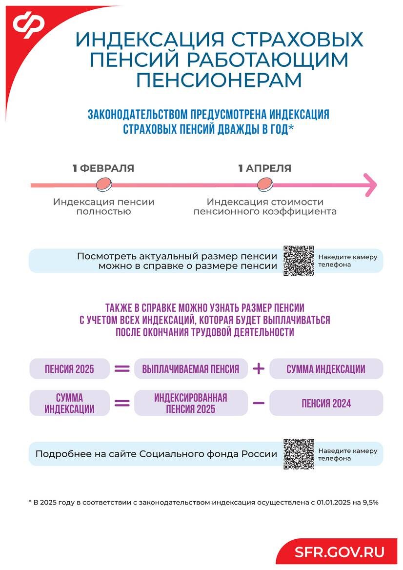 Законодательством предусмотрена индексация страховых пенсий дважды в год. 1 февраля — индексация пенсии полностью. 1 апреля — индексация стоимости пенсионного коэффициента.