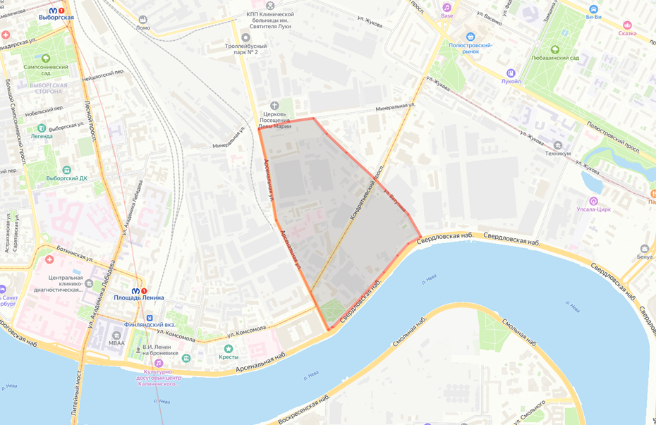 Комитет по градостроительству и архитектуре Петербурга выдал распоряжение ООО "Девелопмент–СПб" разработать проект планировки территории площадью 57,6 га, ограниченной Свердловской набережной, а также Арсенальной, Минеральной улицами и улицей Ватутина в Калининском районе. Эта территория принадлежит заводу "Красный Выборжец", который "Девелопмент–СПб" в 2015 году приобрёл у компании "Л1" Павла Андреева и акционеров ОАО "Красный Выборжец". С тех пор компания пыталась согласовать проект редевелопмента территории. В 2017 году эскиз застройки был одобрен Градсоветом. Также владелец территории сумел добиться перевода части промзоны под жилую и общественно–деловую застройку в генплане. В 2021 году был подготовлен проект планировки территории (ППТ), который обсуждался на общественных слушаниях, однако их итоги так и не были утверждены. Предполагалось, что весь участок будет разбит на пять кварталов, где планировалось построить апарт–отель площадью 58 тыс. м2, четыре гостиницы совокупной площа