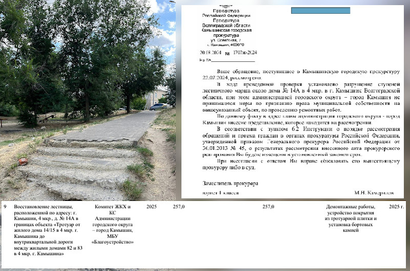 Не удовлетворившись формальным ответом, Егор обратился в Камышинскую городскую прокуратуру. В ходе проверки надзорным ведомством был установлен факт нарушения: объект не был включён в реестр муниципальной собственности, что препятствовало его ремонту. 4 октября 2024 года прокуратура сообщила, что внесла представление главе города. Это побудило власть официально закрепить тротуар и лестницу за муниципалитетом в лице МБУ города Камышина «Благоустройство», а их восстановление включить в муниципальную программу «Благоустройство» на 2025 год.