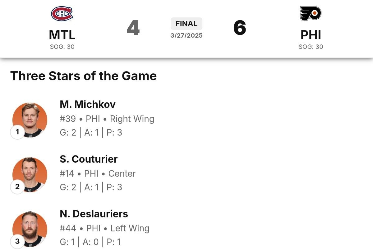 Увольнение Джона Тортореллы с поста главного тренера «Филадельфии» определенно придало импульс Матвею Мичкову. Уже на следующий день после ухода деспотичного наставника 20-летний нападающий «Флайерз» прервал свою 10-матчевую безголевую серию, забросив 2 шайбы в ворота «Монреаля», ведущего яростную борьбу за попадание в плей-офф. С начала игры не прошло и двух минут, как Мичков эстетично завершил комбинацию «летчиков», в которой также поучаствовали Трэвис Конекны и Шон Кутюрье. Видео смотрите в ТГ-канале «Голы с подсказом: наши в НХЛ». И подписывайтесь! Пускай российскому форварду и не удался финальный аккорд, именно он, по версии лиги, стал 1-й звездой матча. А такими комментариями роскошное выступление Мичкова встретили американские хоккейные фаны. @SuitableAlias:– Мичков просто господствовал на льду сегодня, был гораздо быстрее себя обычного, даже в сравнении с лучшими матчами. Похоже, Матвей единственный, кто реально здесь и сейчас выигрывает от ухода Тортореллы. Вот, на что он спос