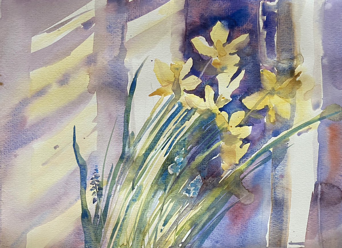 Живущий в сердце художник создает определенные трудности в повседневной жизни. Какие? Сейчас расскажу. В попытке приблизить весну принесла домой несколько луковиц нарциссов. Они пустили стрелки, зацвели и превратили кухонный подоконник в весеннюю клумбу. Теперь каждое утро за завтраком я наблюдаю за переменчивостью цветов и каждый раз хочется их нарисовать. А жизнь-то идет: работа, семья, хозяйство, вот это все) В солнечные дни нарциссы отбрасывают изысканные резные тени на оконные откосы, словно рисуя собственный портрет. А когда небо затягивают тучи, цветы вспыхивают ещё более ярким жёлтым, будто пытаясь осветить хмурый день своим присутствием. Наблюдая за цветами, не перестаю поражаться их удивительной гармонии: с каждым новым распустившимся цветком получается иная, но красивая группа. Недавно слушала подкаст про движение рыб в стае – каждая рыба следит только за ближайшими соседями, но вместе они создают безупречно выверенное движение. Интересно, а есть такие законы про цветение: