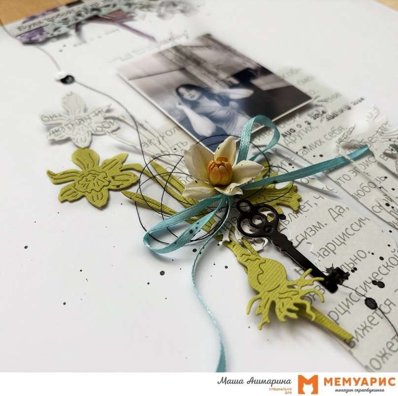 С чего начинается работа над заданием с палитрой? С выбора фото? С обдумывания основных композиционных решений? Конечно же нет. Верное направление подсказывает наш дизайнер. Привет, творческие друзья! Здесь Маша и сегодня мы вместе будем делать страничку по нашей прекрасной палитре 47. С чего начнем, так это внимательно присмотримся к обязательным цветам и поиску материалов под них. Сиреневый цвет я нашла в бумаге от Mintay Paper из коллекции Lilac Garden. Взяла голубую сатиновую ленту и вырубку-рамочку. А зеленый цвет в палитре поддержу вырубкой из картона с тиснением «Зеленый чай». На днях, читая книгу одного восточного мудреца, запомнила цитату про любовь к себе и нарциссизм. В голове засела идея украсить эти слова на страничке прекрасными нарциссами от Mimicut «Вершки и корешки». Распечатала текст на акварельной бумаге чуть приглушенным цветом и начала творить. Сделала фоновую вырубку на акварельке и вырубила сами цветы из зеленого картона. Все, что остается от производства (негати