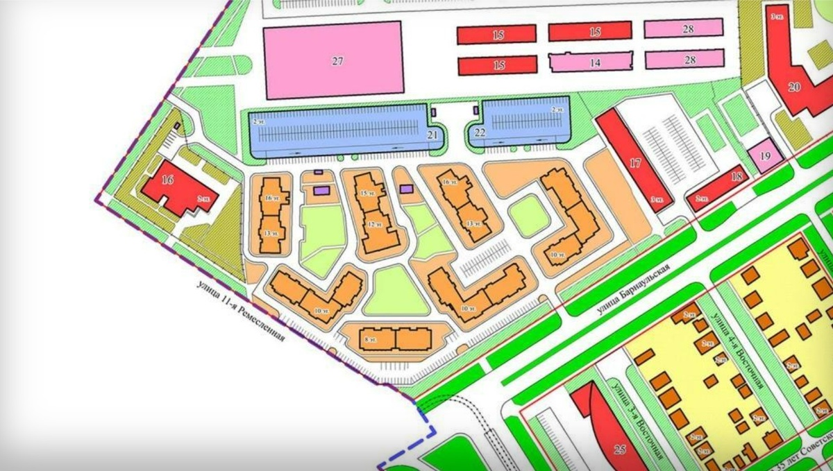Омская мэрия опубликовала проект планировки территории в границах улицы 11-й Ремесленной, Барнаульской, 2-й Восточной и магазином «Победа». Там собираются построить 7 многоэтажек. Высота домов составит 8–16 этажей.
