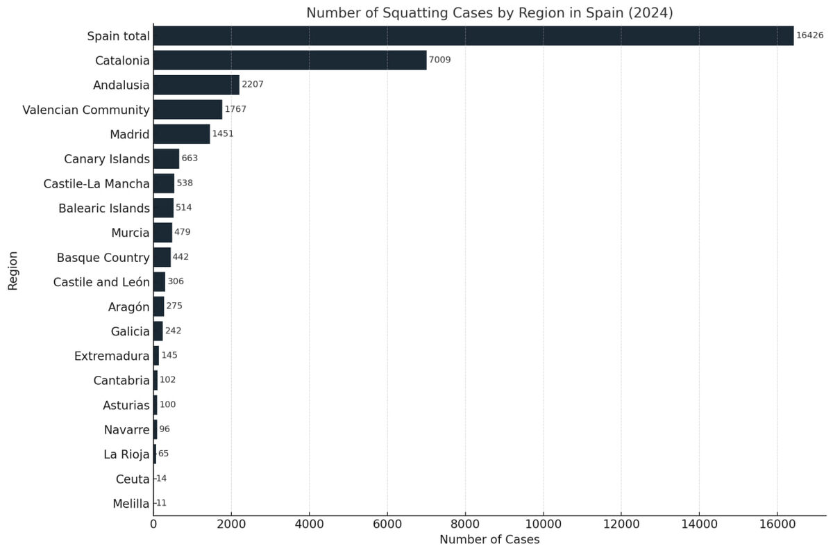 Два года активность испанских сквоттеров снижалась, но, увы, статистика снова растет: в 2024 году зарегистрировано 16 426 случаев, что на 7,4% больше, чем в 2023-м. Испанцы ведут статистику по делам с незаконным проникновением в чужие дома с 2010 года. Пики были в 2021-м (17 274 случая) и в 2022-м (16 765). Еще год страна немного “отдыхала” от сквоттеров (15 289). Или это сквоттеры отдыхали, чтобы в 2024-м взяться за старое с новой силой?! “Лидер” 2024 года по количеству дел и исков, зафиксированных в полиции, – Каталония. Здесь почти половина (42,6%) случаев от общего числа по стране. В цифрах это 7009 проникновений сквоттеров. Больше трети из них – в Барселоне (5077)! Данные по другим регионам – на графике 👆 Конечно, люди идут в полицию, и, конечно, ситуация решается в пользу законных домовладельцев. Только за прошлый год по делам о незаконном проникновении в дома задержано 11 133 человека (лидирует всё так же Каталония). Но общественность все равно: на процедуру законного выселения
