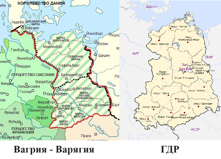Территория бывшей Вагрии (Варягии) почти соответствует территории послевоенной ГДР (Германской Демократической Республики). Зоны оккупации Германии в 1945 году были установлены союзниками по антигитлеровской коалиции не случайно, а по историческим критериям. То есть, ещё во времена И.В. Сталина знали, кто такие были варяги, и что Россия имеет некоторые моральные права на контроль этой территории. Это были бывшие славянские земли. Отсюда «есть пошла Русская земля». Это уже после смерти И.В. Сталина фальсификаторы российской истории типа д.и.н. Е.А. Мельниковой подчистили историю. И кто такие были варяги? – стало, как бы, не понятно. То же касается и Восточной Пруссии, ставшей Калининградской областью. Пруссы были славянским народом, древнерусским русскоязычным народом, уничтоженным немцами. Верховные правители России всегда знали её подлинную историю, хотя от широкой публики скрывали.