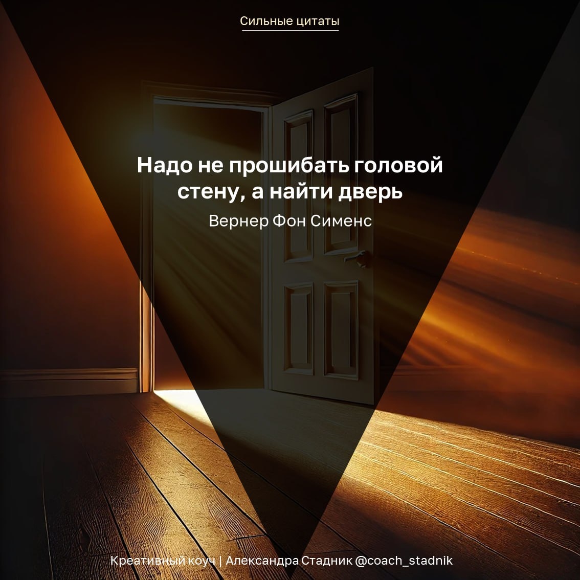 Как часто вы упорно пытаетесь решить проблему в лоб вместо поиска решений? Мне эта фраза напоминает о тех моментах в жизни, когда я очень сильно чего-то хотела, каким-то способом, который придумала сама себе, что должно быть именно так и никак иначе. И чаще всего это были истории слез, истерик, драмы, капризов, смешанные с самообвинениями, ну потому что оно так не работает, если просто думать, что должно 😕 И дверь в таких жизненных ситуациях, когда во мне еще было много юношеского максимализма, мало осознанности, открывалась только тогда, когда я поворачивалась спиной и к ней, и к стене. К сожалению, тогда даже если бы стена все-таки пробилась, или дверь открылась, я уже успела убедить себя, что просто мне это не надо. Если брать здесь и сейчас, то я в чем-то научилась, а где-то еще учусь искать возможности и решения. И как-то само собой происходит, что оказывается и дверей несколько, и окна открыты. #сильные_цитаты #непридуманные_истории ➖➖➖➖➖➖➖➖➖ ✈️ Пригласить друзей в канал ☁