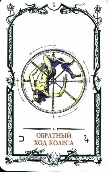 Карта Обратный ход колеса это карта колоды, которая обозначает воспоминания о прошлом, попытки восстановить в памяти события, которые уже произошли, и переосмыслить эмоции, которые они вызвали. Возникновение этой карты свидетельствует о том, что человек сбился с пути и его жизнь идёт наперекосяк. И чем дальше он отклоняется от верного направления, тем сильнее происходит его личностная деградация. В сознании такого человека появляются негативные мысли: зависть, жалость к себе, беспричинная злость, обида на всех и вся. Причина проблем остаётся неясной, но на неё обычно указывают другие карты из расклада. Карта указывает на неверные поступки и, в частности, на ошибки, совершённые в молодости. Жизнь представляет собой замкнутый цикл, и каждый человек рано или поздно вновь столкнётся со своими ошибками, чтобы их исправить. Карта также символизирует стремление человека вернуть ушедшую молодость. Он слишком сосредоточен на прошлом и не хочет впускать в свою жизнь будущее. Аркан также указыва