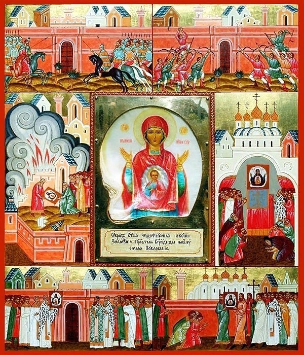 Редкие Иконы Икона Пресвятой Богородицы "Знамение Павловская" Чудотворный образ, обретенный в 1696 г. среди руин крепости Азов после ее завоевания царем Петром I, передавшим икону в собор крепости. После возврата Азова туркам (1711) икону перенесли в Преображенский собор Осередской крепости (позднее г. Павловск). Утраченная после Октябрьской революции 1917 г. икона 17 марта 2002 г. восстановлена по описанию и находится в Преображенском соборе Павловска (Воронежская обл.). Образ был «начертан штрихами» на внутренней стороне створки морской раковины величиной примерно 23 см. Первоначально икона была вставлена в большой деревянный киот с изображением в 6 сценах событий завоевания Азовской крепости и обретения иконы. На ней была надпись: «Сей образ «Знамения» Божией Матери Христовой, начертанный честью на мятице перловой, егда град татарский Азов от бусурман взят, найден на земляном валу и обложен в злато, недостойно бо свящи быти в земной яме, но да светит во храме святем, иже в похвал