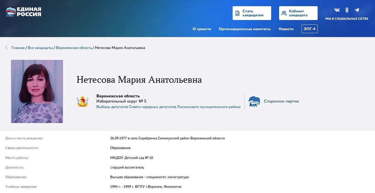 Наше издание следит за тем, какие заявки поступают на региональные праймериз «Единой России». Оказалось, что заявку на предварительное голосование подала однофамилица спикера Воронежской областной Думы и секретаря реготделения партии власти Владимира Нетесова. Речь идет о Марии Анатольевне Нетесовой, которая родилась 26 сентября 1977 года в селе Серебрянка Семилукского района. Она имеет диплом ВГПУ по специальности «филология». Сейчас работает старшим воспитателем в детском саду №10.
