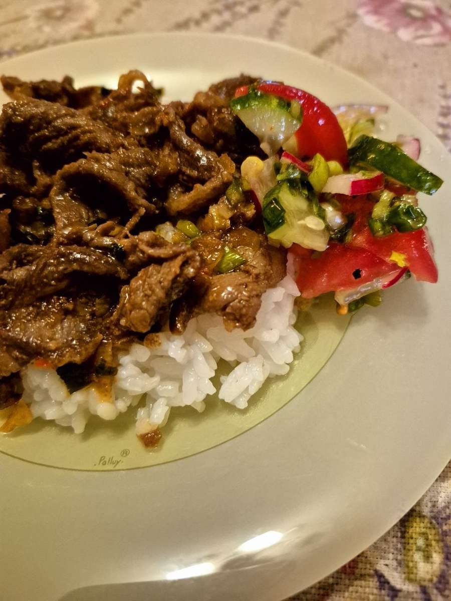 Говядину нарезаем тонкими слайсами (удобнее это делать с подмороженным мясом), добавляем яйцо, немного соли и перца (не забываем, что позже добавим к мясу соус, в состав которого входит соевый соус, а он сам по себе соленый), все тщательно перемешиваем и оставляем на полчаса. Лук режем мелким кубиком, чеснок мелко рубим. Зеленый лук также мелко режем. В отдельной мисочке смешиваем соевый соус, соус сладкий чили, мед. Рис промываем в проточной воде, добавляем воду (один к одному), ставим на плиту, кипятим, убираем огонь до минимума, томим под крышкой 15 минут. Мясо быстро обжариваем со всех сторон в разогретой с маслом сковороде, откладываем на тарелку в сторону. Лук и чеснок обжариваем на той же сковороде до золотистого цвета. Добавляем полученный соус, варим минуты три - четыре и добавляем в соус наше жареное мясо, перемешиваем и добавляем зеленый лук, снова перемешиваем. Наше мясо готово. Выкладываем на тарелочку рис, сверху говядину в азиатском стиле и с удовольствием кушаем. Для