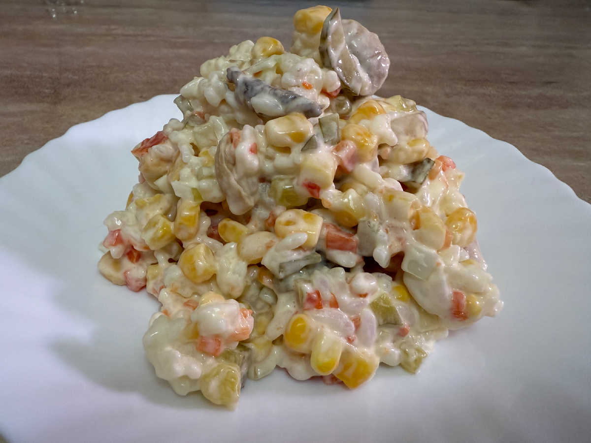 Добро пожаловать на мою кулинарную страничку! Предлагаю вам приготовить вкусный постный салат из риса. Он получается ярким, свежим и достаточно питательным. Надеюсь, что этот рецепт разнообразит ваше постное меню) Ингредиенты: ****************************************************************************************** Приготовление блюда: 1. Рис отварить до готовности в подсоленной воде, полностью остудить и выложить в салатник. 2. Выложить в салатник консервированные шампиньоны, с которых необходимо слить всю жидкость. Я покупаю уже резанные грибы - это очень удобно и экономит мое время. 3. Добавить консервированную кукурузу. 4. Вареную морковь нарубить мелким кубиком и выложить в салатник. 5. Маринованные огурцы так же мелко нарезать. 6. Репчатый лук меленько нашинковать ножом. 7. Добавить соль по вкусу, постный майонез и все перемешать. Салат можно сразу же подавать к столу. Он получается безумно вкусным! Приятного аппетита!