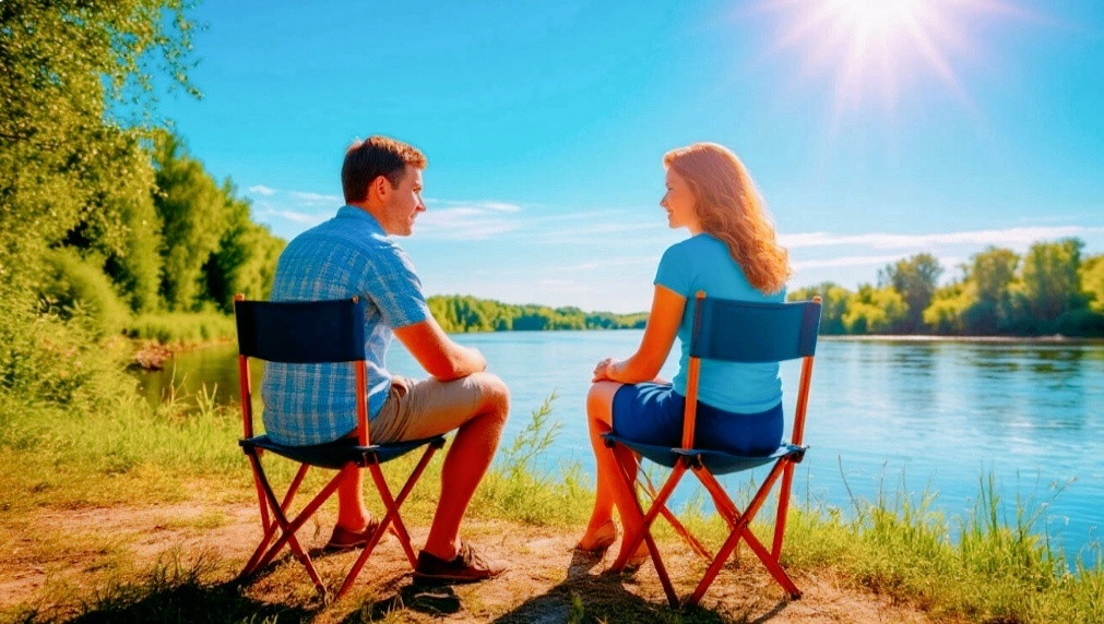 Молодожёны быстро постелили на траву плед, поставили рядом два раскладных стула и выложили бутерброды. У Юли нашёлся ещё и термос с горячим кофе.