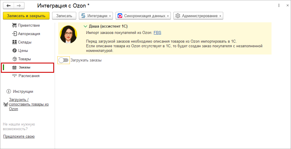 Для оперативной обработки заказов реализована загрузка заказов из марекетплейса в программу, в настройке интеграции появилась закладка «Заказы».