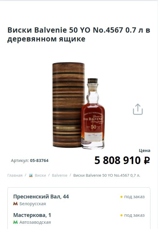 Кстати, о Виски. Один из пунктов в копилке инвестора с высоким чеком - «Редкие вина и алкоголь». Если не страдаете алкоголизмом - отличный вариант для инвестиций. Основные факторы удорожания: • Ограниченный выпуск: многие редкие сорта больше не производятся. • Рост спроса: популярность коллекционного виски среди инвесторов и энтузиастов. • Возраст бочки: виски стареет, что увеличивает его ценность. • Глобализация рынка: рост интереса к виски в Азии (особенно в Китае и Японии). Вот кстати, интересный экземпляр - Виски Balvenie 50 YO No.4567 0.7 л в деревянном ящике. Стоимость 5 808 910 ₽. Пол студии в Москве, или быть счастливым – выбор очевиден)) UPD: ну а тем кто случайно собирается в сторону Туманного Альбиона, вот перечень сайтов: - www.thebalvenie.com - здесь вы можете найти информацию о текущих релизах, партнерских магазинах и дистрибьюторах. Для таких редких выпусков Balvenie часто сотрудничает с эксклюзивными продавцами. - www.whiskyshop.com - один из крупнейших ритейлеров