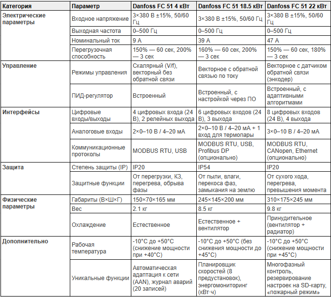 Частотные преобразователи (ЧП) являются неотъемлемой частью современной промышленной автоматизации. Они позволяют управлять скоростью электродвигателей, снижать энергопотребление и продлевать срок службы оборудования. Одним из ведущих производителей ЧП является компания Danfoss, предлагающая надежные и высокоэффективные решения. В этой статье рассмотрим три модели частотных преобразователей серии VLT Micro Drive FC 51: