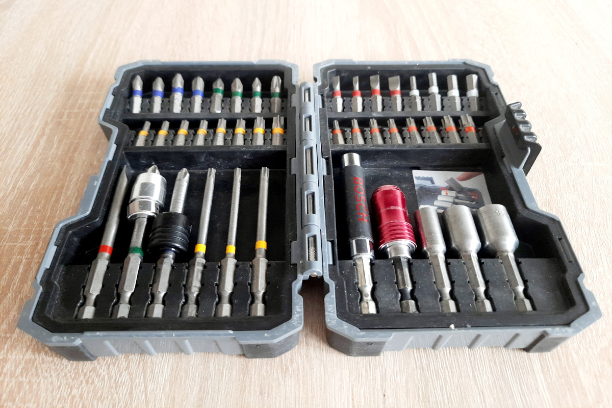 Мой надежный арсенал: набор бит Bosch, модель - 2607017164, который не подводит! Приветствую, дорогие читатели и коллеги! Хочу рассказать о своём верном помощнике – о наборе бит и головок Bosch (2607017164) для шуруповёрта и не только. Не нахваливаю, но всё же этот набор в разы лучше чем китайские пластилиновые! Набор данных инструментов проверен в реальной работе. И да, если по честному - как бы наверное хвастаюсь. Однако: может быть кто то и приглядывается к такому набору в раздумиях, планируя его приобрести. И явно не прогадает. Это 43 предмета в удобном пластиковом кейсе, с которыми я уже 5 лет не знаю проблем. И знаете что? Они до сих пор как новые! (Хотя и есть один маленький, несущественный недостаток, о котором сказано в конце этой статьи) ✔ Два удобных держателя: Магнитный универсальный – биты не теряются, даже если работаешь в неудобном положении. Быстросменный – замена бит за секунду, без лишних движений. ✔ Биты (25 мм) на все случаи жизни: Крестовые: PH1, PH2 (2 шт.), PH