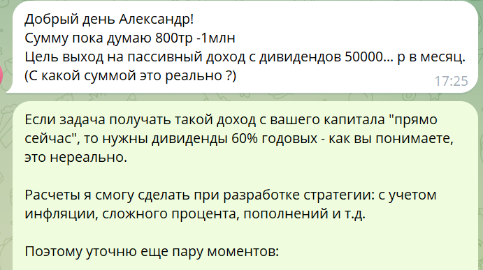 60% дивидендов за 1 год - реально? Честность специалиста по инвестициям, к сожалению (или к счастью) прямо противоположна его финансовым интересам. Нет ничего проще, чем наобещать 60% дивидендов за 1 год! Хотите инвестировать 1 миллион рублей - и выйти на 50 000 рублей в месяц пассивного дохода?! Да, легко! Несите свои денежки, не думайте, так ли это на самом деле! Вот только нереалистично - без работы сложного процента, а значит без времени и/или регулярных пополнений. Очень часто мне приходится "резать" ожидания клиентов: ❌ Такой доходности не бывает ❌ Поставленные сроки нереалистичны ❌ Подобные дивиденды обещают лишь мошенники ❌ Эти акции слишком рискованы ❌ А в этих облигациях вас ждут одни проблемы И, разумеется, часть клиентов после этого отваливается: хочется много, быстро и без риска. А обещать этого я не могу (см. пункт про "честность" и "финансовые интересы"). На что я могу надеятся, что люди НЕ уходят туда, где им все это обещают, выбирая "финансовые интересы", желая впарит