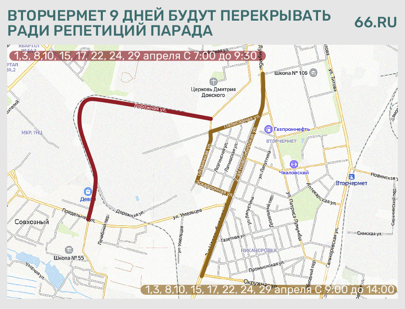 Изменения затронут автобусы № 81, 77, 53 с 09:00 до 14:00 в следующие дни: 1, 3, 8, 10, 15, 17, 22, 24 и 29 апреля. Транспорт будет передвигаться по следующим маршрутам: В течение этих 9 дней на Вторчермете будет ограничено движение любого транспорта в связи с репетициями парада. Перекрытия затронут улицы Дорожную (с 7:40 до 9:30), 2-ю Новосибирскую, Зенитчиков, Палисадную, Окраинную и Эскадронную (с 09:00 до 14:00). Текст: Елизавета Малькова