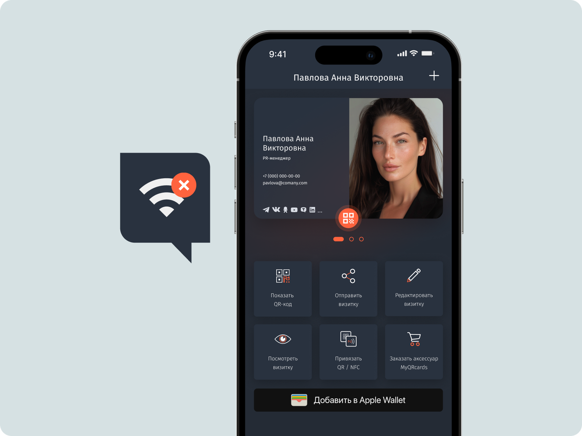 Если у собеседника нет доступа к интернету, вы можете показать QR-код своей визитки на экране смартфона. Этот формат QR-кода позволит сохранить контакт сразу в телефонную книгу. Шаг 1. Запустите приложение MyQRcards на своём смартфоне Шаг 2. На главном экране в меню выберите «Показать QR-код» Шаг 3. Далее необходимо нажать «Оффлайн QR-код» Шаг 4. Покажите экран собеседнику, чтобы он смог отсканировать QR-код камерой своего смартфона Шаг 5. Собеседник выбирает «Создать новый контакт» и нажимает «Готово» Этот способ удобен на мероприятиях и встречах, где интернет может быть нестабильным, но обмен контактами по-прежнему важен. С сервисом Myqrcards вы сможете легко создать электронную визитку и мгновенно делиться своими контактами в любой ситуации.