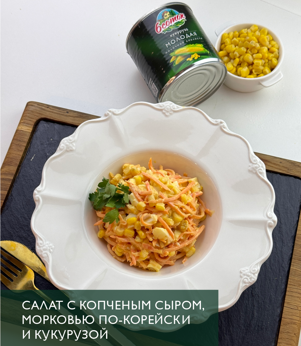 • Копченый сыр (чечил, косичка) - 150 г• Яйца - 4 шт. (отварные)• Морковь по-корейски - 200 г• Кукуруза консервированная «6 соток» - 1 банка• Майонез - 150 г
