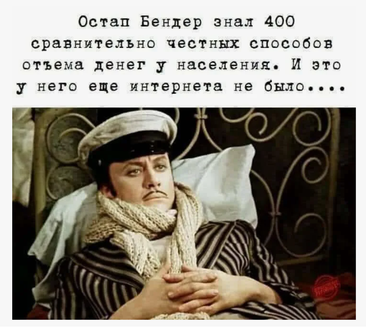 Казалось бы, со времен МММ и “Хопер-инвест” люди должны научиться горьким опытом и не вестись на новые авантюры. Но нет… еще появлялись и гремели Кэшберри, Финико, MMCIS, разные хайп-проекты в интернете… И еще появятся десятки Остапов Бендеров и их 400 сравнительно честных способов отъема денег у населения.