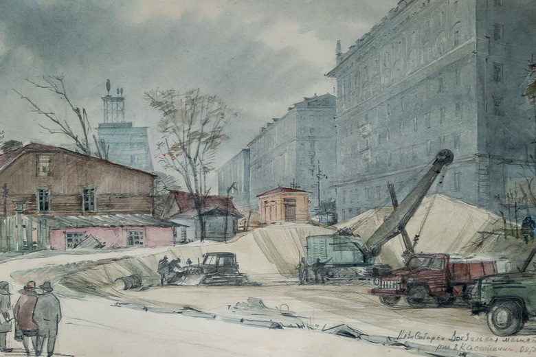 1. Для начала, рисунок замечательного художника Василия Касаткина, оставившего потрясающие акварели строящегося Новосибирска 50-70-хх годов. Исторический момент – пробивка Вокзальной магистрали. Мне не встречалось ни одной фотографии на эту тему. А тут видно, как уходил старый город.