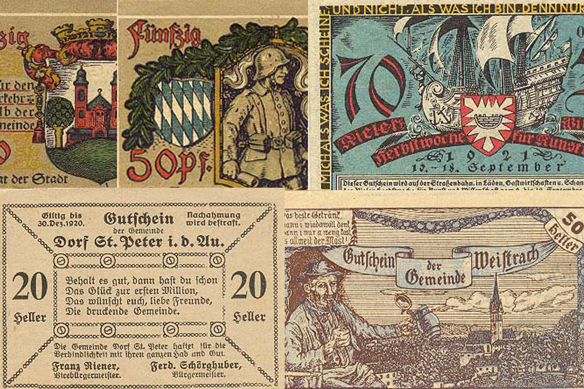 Но это не значит, что в Австрии нет "красивых купюр". Посмотрите на нотгельды Грёдига и Халлайна. Кроме того, есть ещё очень красивые купюры Раттенберга, Вёргля и других тирольских муниципалитетов, например Айзенерца. Только немецкие "красивые" купюры, безусловно, в избытке, но это, конечно, также объясняется соотношением размеров двух стран. И, конечно же, у немцев есть также банкноты, которые примерно соответствуют австрийским купюрам.