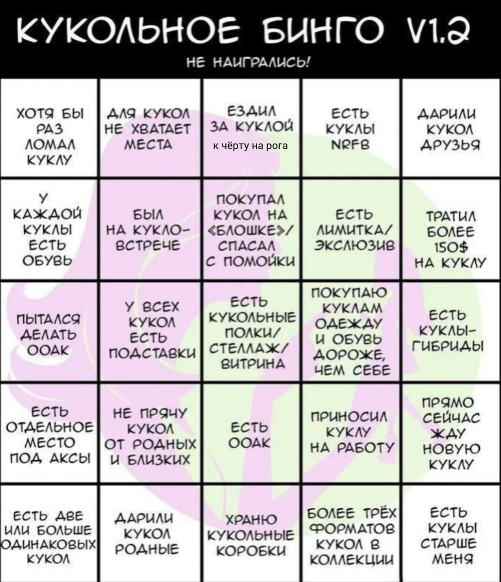 Всем доброго времени суток! На днях я увидела сразу несколько Бинго для кукольников, и, собезьянничав вдохновившись статьёй автора канала "Злая Белоснежка и её куклы", решила написать про них на своём канале. Вот мой результат: Немного расскажу про отмеченные мной пункты: 1. Сломала шейный якорь у куклы во время первой гибридизации. К счастью, потом удалось его склеить. 2. Кукольной обуви у меня очень много, на все 8 кукол моей маленькой коллекции точно хватает. 3. Подставок пока ровно столько же, сколько и кукол, но боюсь, что скоро придётся покупать новую партию) 4. Честно говоря, кукольных полок у меня несколько, и коллекция кочует то на одну, то на другую. 5. Куклы-гибриды — это половина моей коллекции. Мне нравятся мтм тела, поэтому почти всех кукол с плохой подвижностью я пересаживаю на них. 6. Для аксессуаров, одежды и обуви у меня выделен отдельный ящик шкафа. В свою очередь, там всё разложено по контейнерам и пакетикам. 7. Тут прибавить нечего) 8. Двух кукол мне дарили родные
