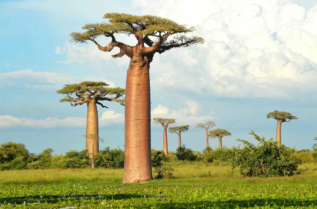 Он возвышается над африканской саванной, как древний страж, его массивный ствол хранит воду, а ветви, похожие на корни, будто тянутся к самому небу. Это баобаб — дерево-легенда, символ Африки, чей возраст может достигать 2000 лет. Как ему удается быть «деревом жизни» для людей, животных и целых экосистем? Погрузимся в тайны этого великана! Баобаб (Adansonia) выглядит так, словно его посадили вверх тормашками: могучий ствол, достигающий 25 метров в обхвате, увенчан редкими ветвями, напоминающими корни. В сезон дождей на них распускаются огромные белые цветы, которые живут всего одну ночь. Их аромат привлекает не пчел, а… летучих мышей! Эти крылатые опылители пируют нектаром, пока луна освещает саванну. В засушливых регионах, где дожди редки, баобаб накапливает до 120 000 литров воды в своем пористом стволе. Кора, толстая как броня, защищает его от пожаров и слонов, которые иногда обдирают ее в поисках влаги. А в сезон засухи дерево сбрасывает листья, чтобы сократить испарение. Но настоя