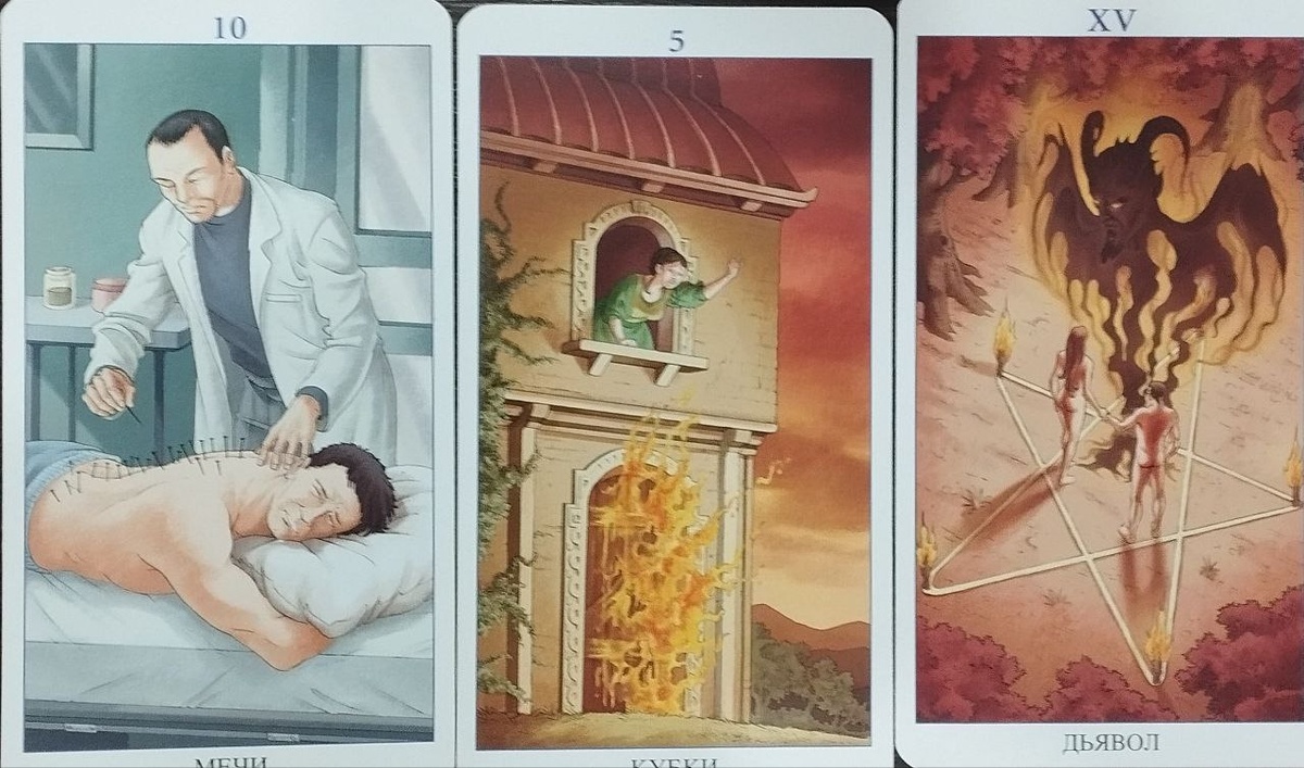 Если на его чувства выпадают Пятёрка Кубков, Десятка Мечей или Дьявол, это говорит о том, что он не так уж и счастлив, как пытается казаться.