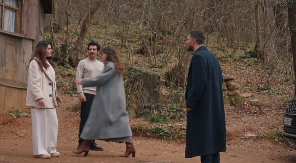 Наз замечает, что Инджила в ужасе смотрит ей за спину. Обернувшись, Наз видит, что в домик вошли Мете и Кадир и понимает, что они могли услышать ее слова.