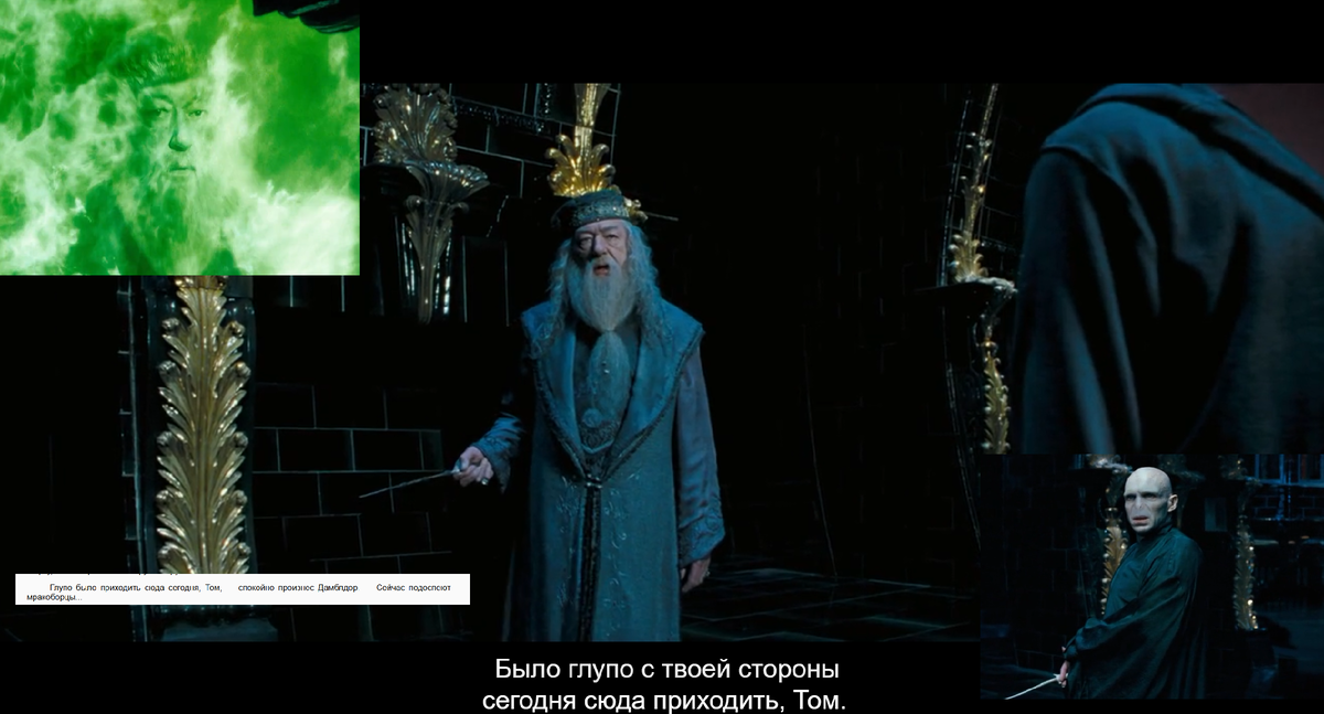 И да, кстати, из Водяной Тюрьмы Волан-де-Морт сбегает с помощью Трансгрессии, т.е он сперва просто силился побороть массу воды, но потом понял, что верный путь - телепортация из него прочь. По сути, на этом само сражение и заканчивается в книге! Но здесь же решили расширить динамику, хотя, что в книге, что в фильме - сцена небольшая, поэтому мы просто видим СПРЕССОВАННЫЙ ЭКШН!