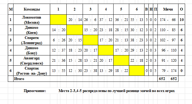 1. «Буревестник» (Москва). 2. «Локомотив» (Москва). 3. «Старт» (Ленинград). 4. «Буревестник» (Ростов). 5. «Металлург» (Москва). 6. «Буревестник» (Одесса)*