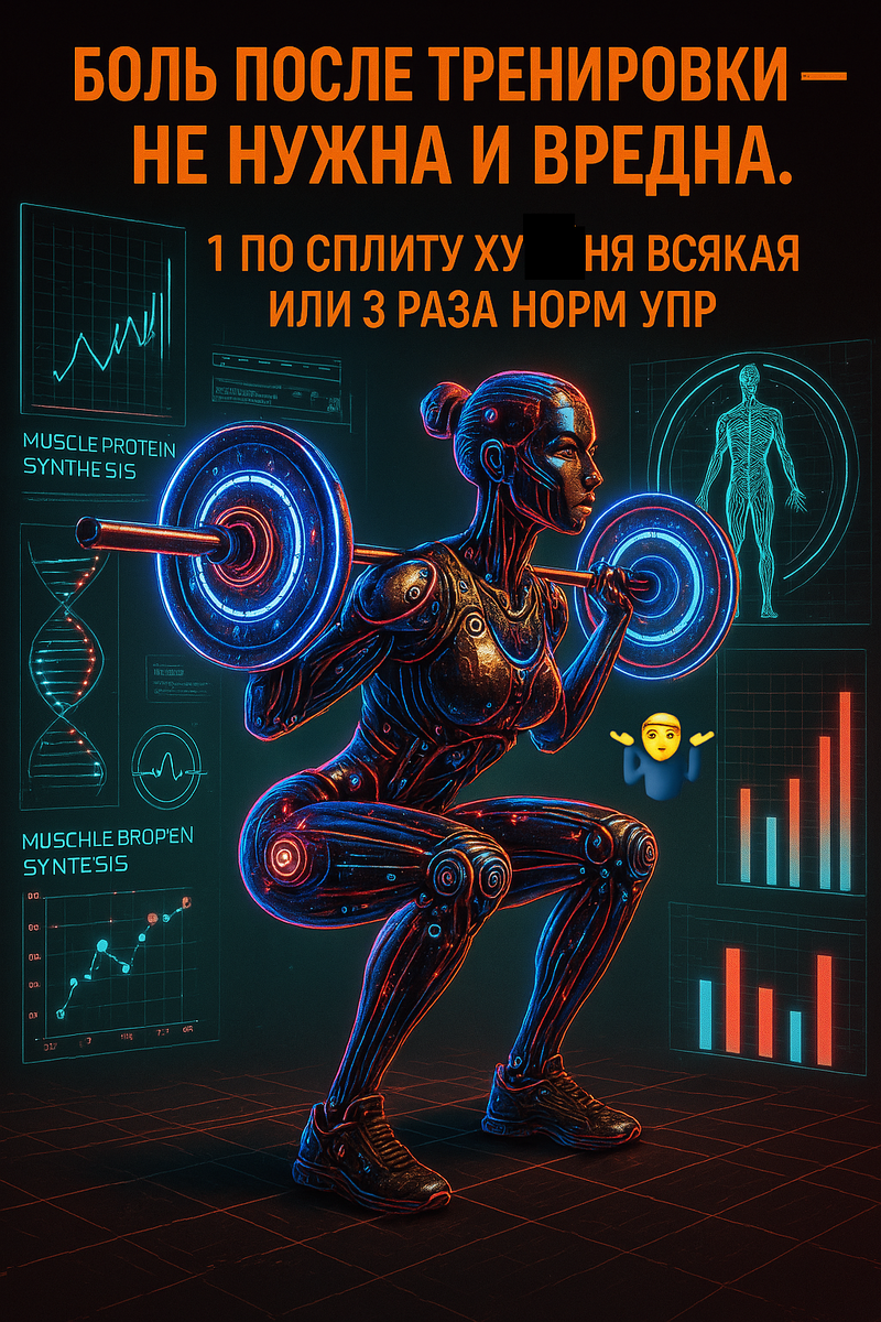 Хватит измерять качество тренировки крепатурой. Это как мерить успех свидания количеством синяков: вроде что-то было, но скорее всего – всё пошло не так. 📊 Исследование (https://pubmed.ncbi.nlm.nih.gov/29489727/): сравнили две группы. 💥 Итог: А вот приросты мышц… одинаковые 🤷♂️. Да, несмотря на разницу в болевых ощущениях, мышцы выросли одинаково. Вывод? Боль ≠ рост. 📚 Другое исследование (https://pubmed.ncbi.nlm.nih.gov/27219125/) прямо заявляет: «высокий синтез белка = рост мышц, но ТОЛЬКО если нет сильной травматизации тканей». То есть, если вы разнесли себя в ноль, то всё уходит на "починку", а не на рост. Грубо говоря, вы строите не новый дом, а латаете дыры в старом сарае. Представим типичный день ног: И всё это в один день? 🤯 Вы же не робот. Или вы умираете на пятом упражнении, или делаете вполсилы весь объем. Теперь смотрим на фулбоди: