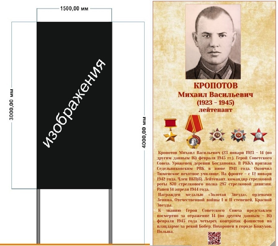 На состоявшемся 26 февраля заседании Совета Седельниковского муниципального района депутат Евгений Кужелев выступил с ходатайством об увековечении подвига нашего земляка, уроженца деревни Богдановка, Героя Советского Союза Кропотова Михаила Васильевича. Вариант баннера и его оформления, который может появиться в Седельниково. Эскиз разработан Сергеем Плеховым Напомним, для сохранения памяти отважного офицера в Седельниково и Богдановке открыто несколько мемориальных досок, у Седельниковской СШ №1 установлен его бюст, но нет ни одного информационного стенда, который бы в режиме реального времени «рассказал» нашим землякам о подвиге, совершенном ротой Михаила Васильевича на плацдарме за рекой Бобер, на котором были бы отражены четыре его боевых ордена и медаль «Золотая Звезда», а также портрет фронтовика. 16 февраля 2025 года исполнилось 80 лет со дня гибели Кропотова, этой дате были посвящены зональные соревнования ветеранов и молодежи, которые прошли в Седельниково. До 9 Мая, до 80-лет