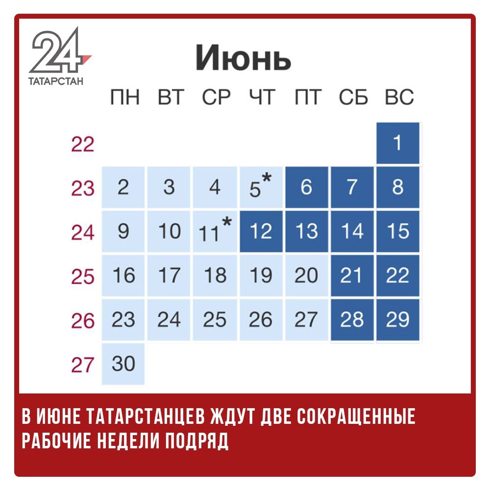 📆🎉В июне татарстанцев ждут две сокращенные рабочие недели подряд