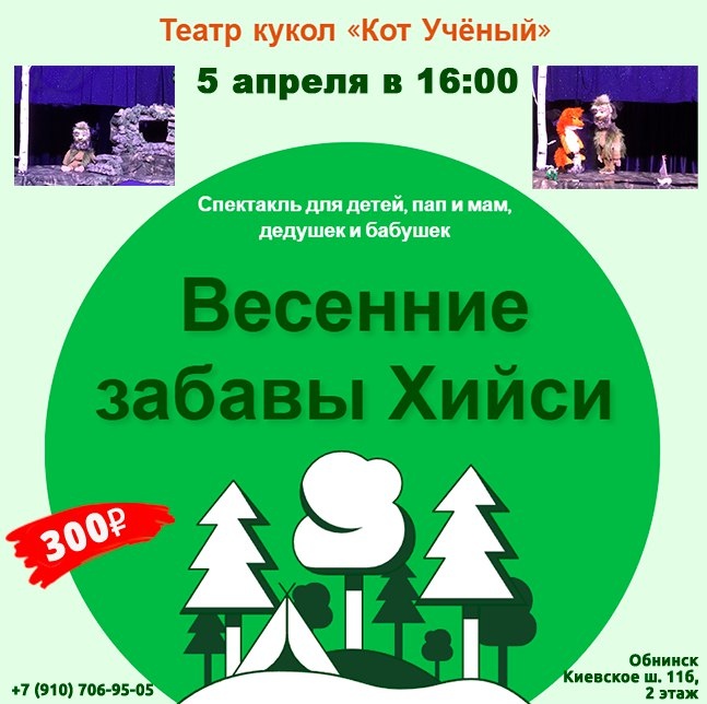 Театр кукол «Кот Учёный» в Обнинске представляет спектакль «Весенние забавы Хийси» (5-10 лет), а также МК: ❗ТОЛЬКО❗ ▪5 апреля в 16:00 + Мастер-класс по работе с перчаточной куклой и знакомство с куклой на запястье ❗за 15 минут до спектакля❗ 🌿В основе спектакля карельская народная сказка «Березовый сок». Весна. Природа облегчённо вздыхает: перезимовали! И лес радуется и его обитатели. И только карельский леший (Хийси) всё никак не может проснуться, а очень хочет: боится весну проспать. И решает Хийси позабавиться: разыграть возле своего дома весёлую историю про березовый сок. И артистов подобрал: Белка, потерянная Рукавица и Ежиная Иголка. А ещё из Лисы делает артистку. 🎟Цена: 300₽ вне зависимости от возраста и на каждого зрителя. 📲 +7 (910) 706-95-05/+7 (910) 914-21-76. 🚩Обнинск, Киевское шоссе, 11Б, ТЦ «Обнинский», 2 этаж.