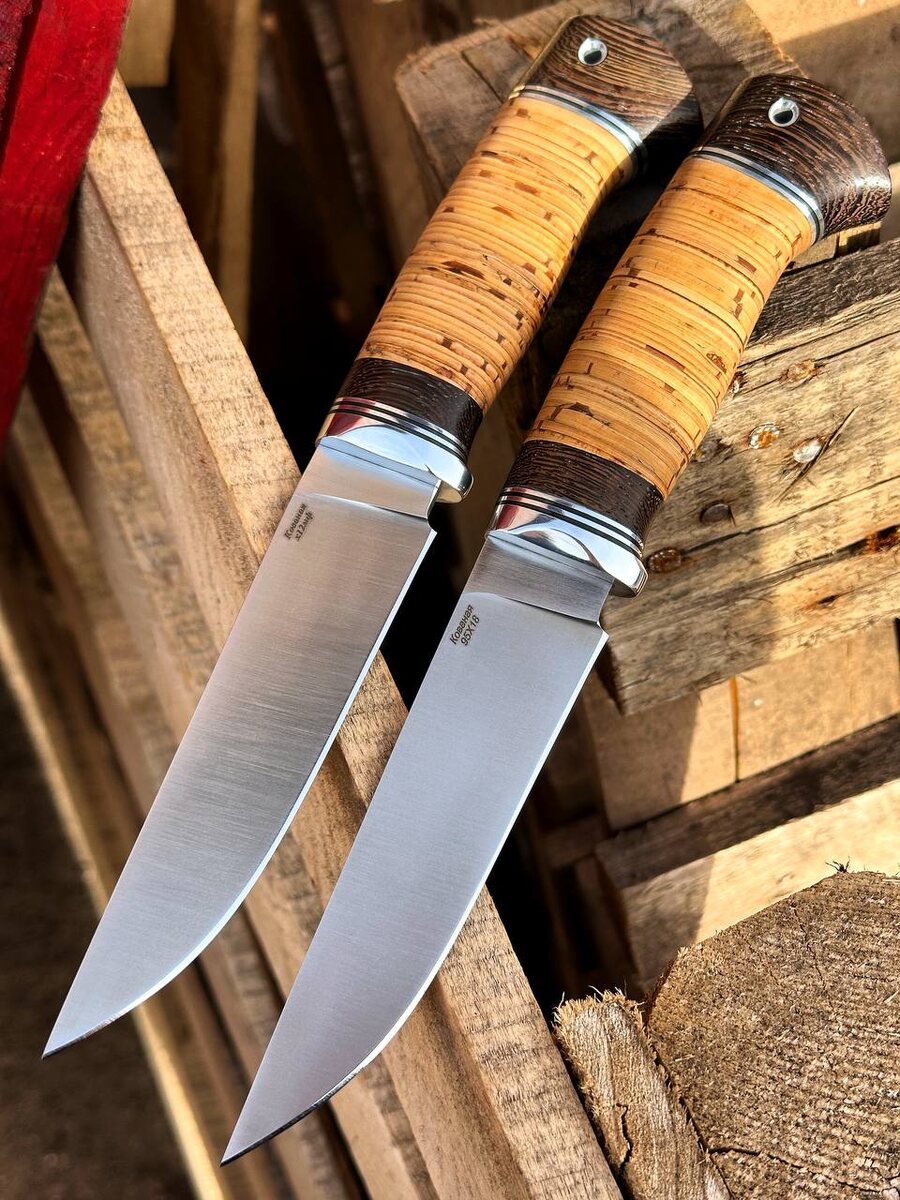 Вроде бы как в мультфильме: Двое из ларца, одинаковых с лица ! Да, одинаковые на внешний вид, но разные по содержанию ! Слева нож Барс из кованой стали х12мф (отечественная инструментальная сталь с высокой твердостью HRC 61-62, долго держит заточку и имеет агрессивный рез). Цена по 30 апреля 8250 руб. Справа нож Барс из кованой стали 95х18 (отечественная нержавеющая сталь с твердостью 58 HRC). Цена по 30 апреля 7515 руб. На каждом клинке прямые спуски от обуха, финишная шлифовка в сатин, бритвенная заточка режущей кромки. Берестяная рукоять на каждом ноже. Ножны в комплекте. Можем изготовить формованные ножны из кожи растительного дубления (+ 8000 руб.) Для заказа писать на @Nazarklinokbot или по тел +79101343831, WhatsApp