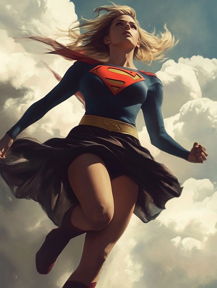 Создано на основе запроса: Supergirl: a beautiful digital comic book rendering of Supergirl flying in the clouds, wearing a skirt, follow