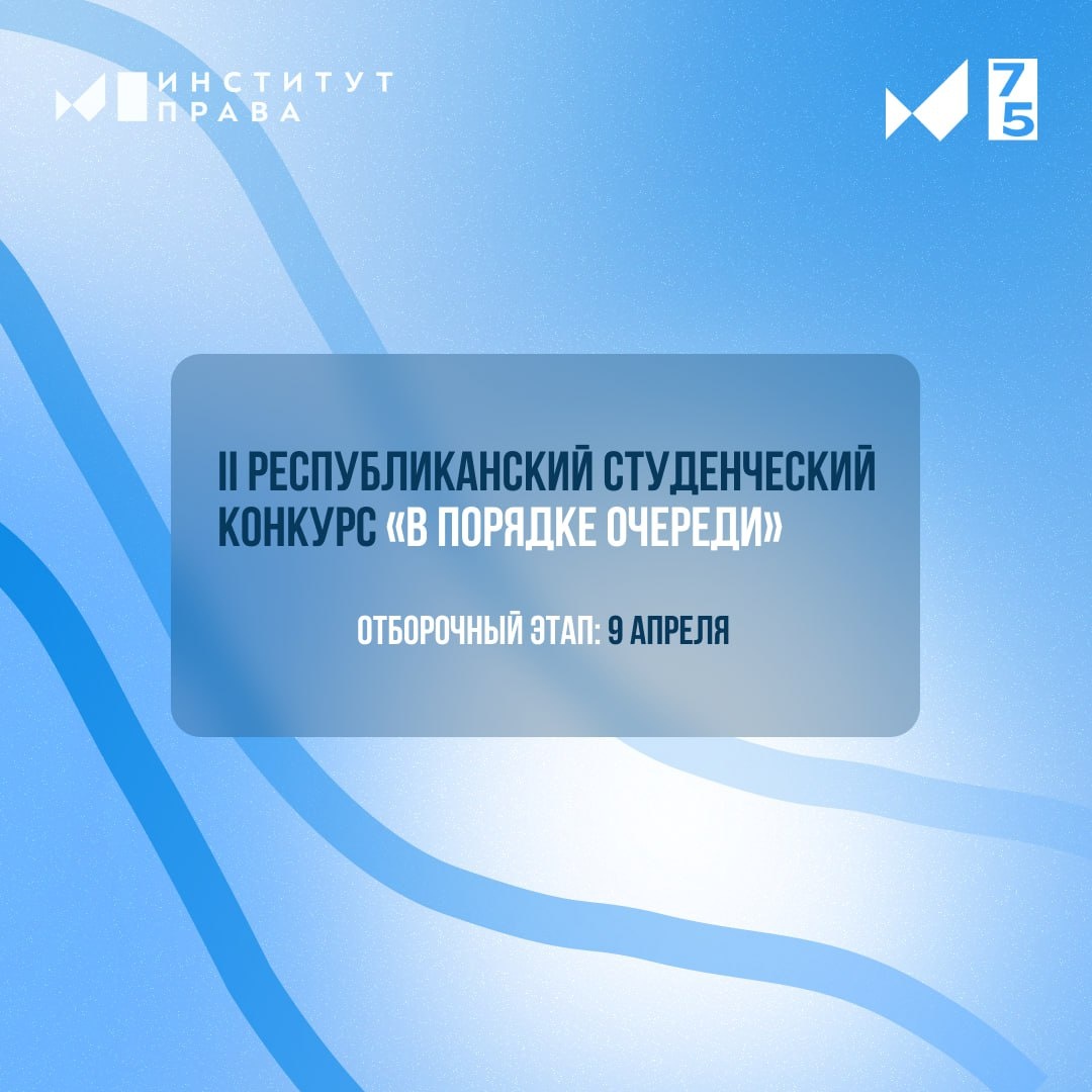 17 апреля 2025 года состоится II Республиканский студенческий конкурс по наследственному праву «В порядке очереди»! 🏆 Проверь свои знания, обменяйся опытом с другими студентами и докажи, что ты лучший в наследственном праве! 🤓 Этапы конкурса: 🔹Отборочный этап: 9 апреля, с 14:00 до 15:00 (❗️строго❗️) 🔹Тестирование: https://forms.yandex.ru/u/67eef233eb61462f66a9a962/ 🔹Финальный этап пройдет очно 17 апреля 2025 г. Обязательная регистрация для участия: https://forms.yandex.ru/u/67d42b0d50569061e6cbd6e4/ Не упустите шанс стать лучшим!💙 Подробности по ссылке🔗