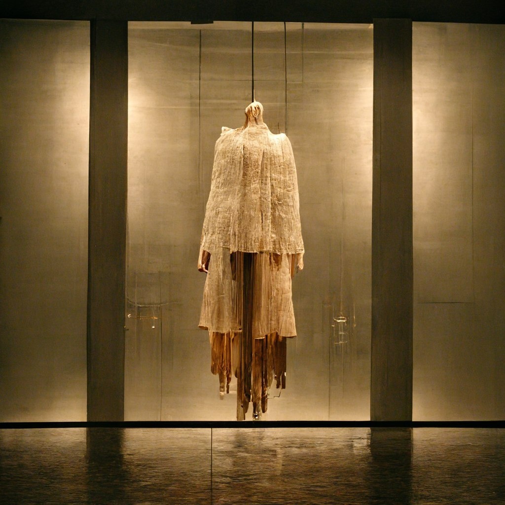Создано на основе запроса: A realistic fashion photograph of a surreal fashion installation in a minimalist, arctic-inspired beige-toned exhibition space. A single Lemaire-style garment in a neutral tone is suspended in mid-air or hung in front of a vertical glass panel, approximately 0.3cm thick, positioned 10cm in front of the garment. The glass is crystal-clear and overlaid across its entire surface with --- Автоперевод: Реалистичная модная фотография сюрреалистической модной установки в минималистском, вдохновленном арктическом бежевом выставом пространстве. Интересно выглядит? 🤔 https://dzen.ru/id/65c0c65c86e4f837c27b24d7 #ИИ #AI #нейросеть #midjourney #art