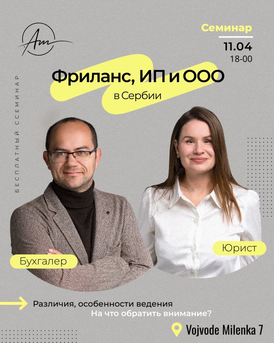 БЕСПЛАТНЫЙ семинар "Фриланс, ИП и ООО в Сербии: Различия, особенности ведения, на что обратить внимание!" 10.04 в четверг в 18-00 проведут для вас бухгалтер и юрист AskMe Agency! 🔍 Рассмотрим все плюсы и минусы, кому выгоднее фриланс, ИП, а кому ООО, обсудим особенности открытия и ведения, подводные камни, частые ошибки, поделимся своим опытом и ответим на ваши вопросы. Присоединяйтесь! 📩 Запись на семинар в комментариях под этим постом👇 Количество мест ограничено! ⏰ 10 апреля в 18:00 🏠 В нашем офисе на Vojvode Milenka 7
