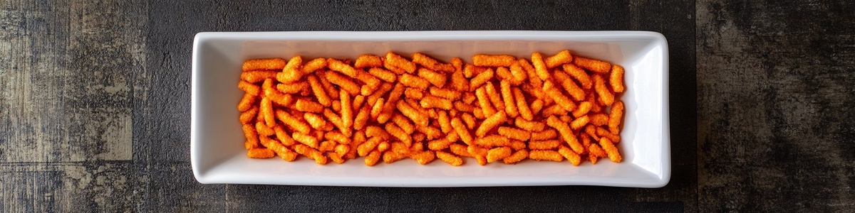 Создано на основе запроса: an overhead view of a long rectangular white ceramic dish filled with flaming hot Cheetos. Sony A65 camera.