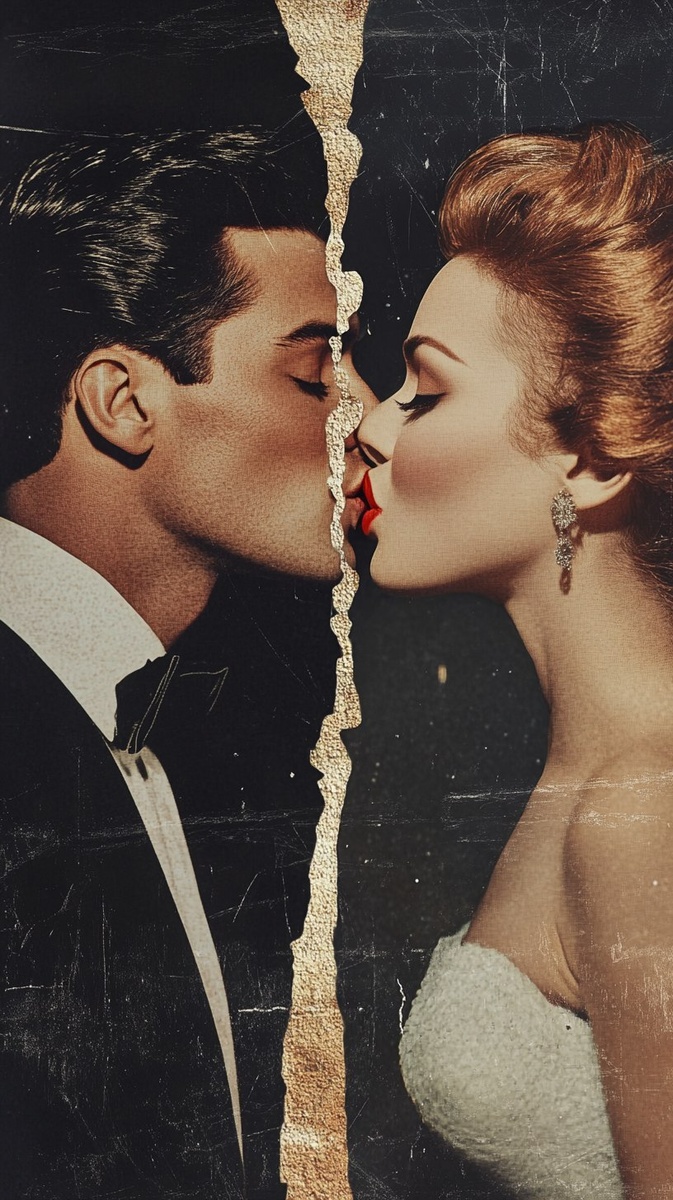 Создано на основе запроса: a split scene: glamorous romantic kiss from 1930s film on one side, and humorous bad breath reaction on the other, vintage aesthetic, cinematic collage style, classic Hollywood lighting