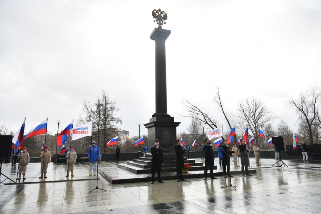 Карельские артисты исполнили на торжественном митинге патриотические песни, а жители Петрозаводска возложили к стеле «Город воинской славы» цветы в память о героических предках. // Фото: пресс-служба правительства Карелии.
