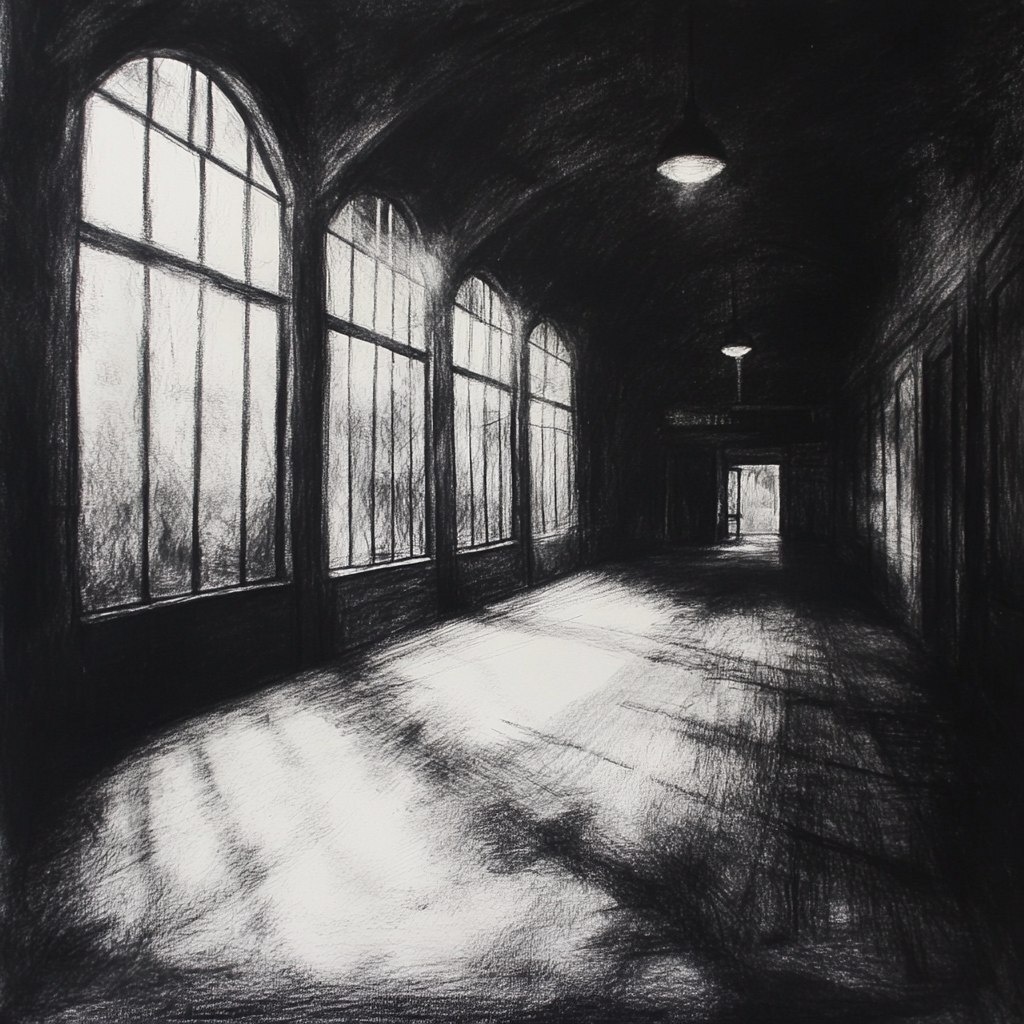 Создано на основе запроса: charcoal drawing of a dark, empty train station with the only light coming from the large window with muntins shining dramatically down