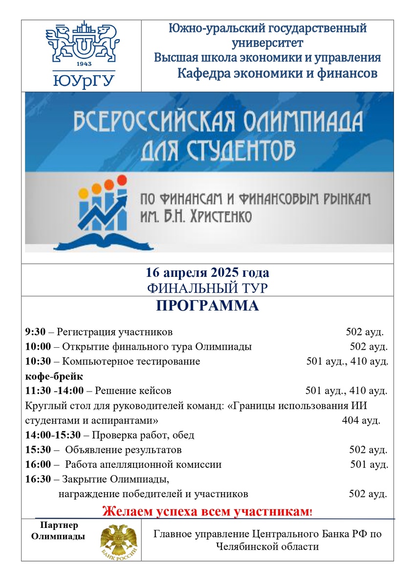Поздравляем победителей и приглашаем к участию в Финальном туре Олимпиады, который пройдет в очной форме 16 апреля 2025 года в ФГАОУ ВО ЮУрГУ (НИУ), г. Челябинск, пр. Ленина, 76.