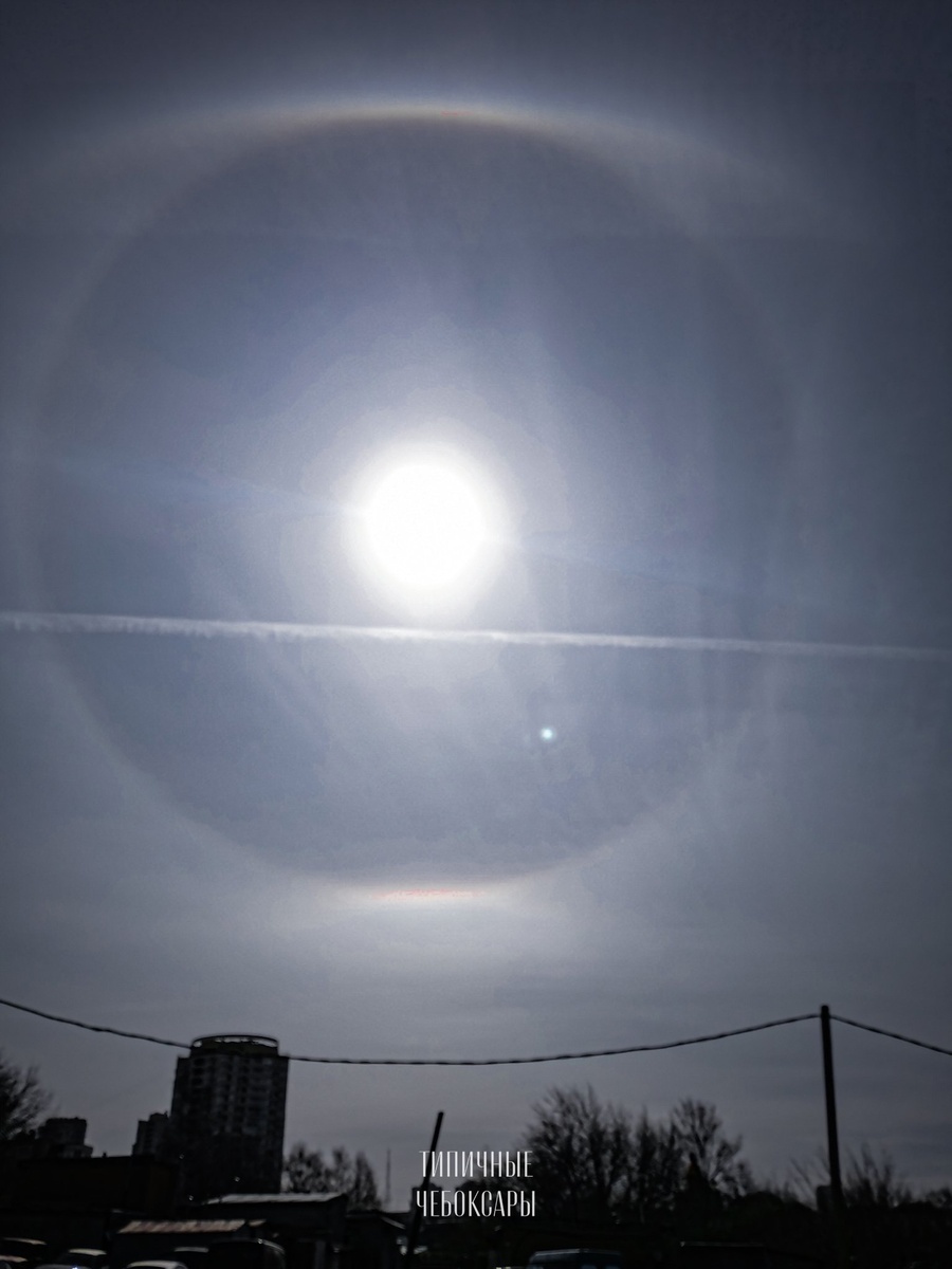Сегодня на Чебоксарами можно было увидеть солнечное гало светящийся круг вокруг солнца. Возможно это вызвано предстоящими сильными геомагнитными бурями.