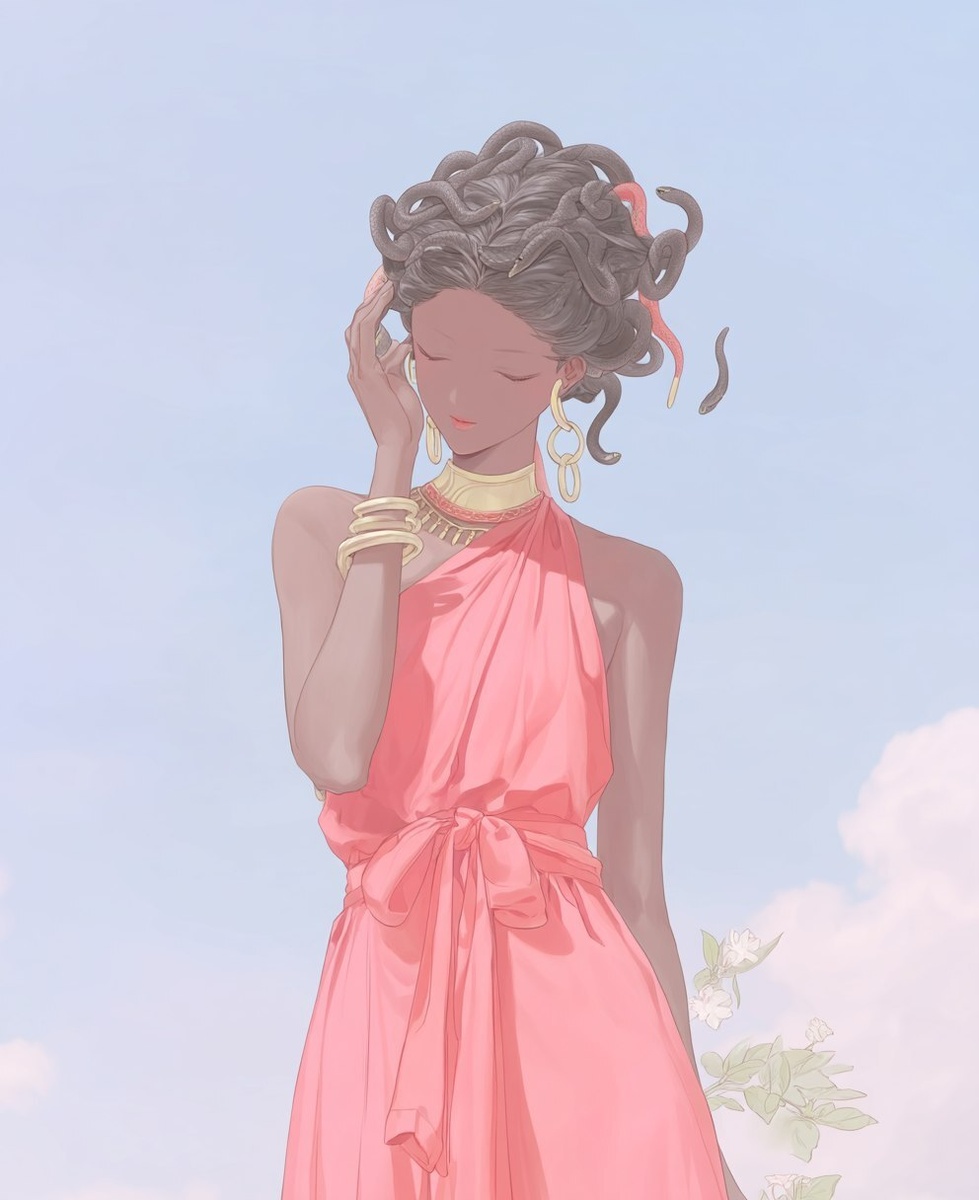 Автоперевод: великолепная медуза, греческая иллюстрация, красивая коричневая кожа, черная змея, красивая, темно -красная туника, красивое небо на заднем плане,